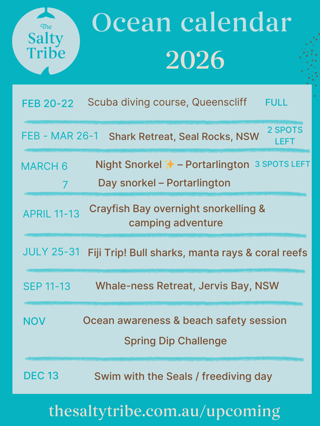 Sign up to our email list below to be the first to receive event details when released, or consider joining our Salty Tribe Club where you will receive exclusive benefits and discounts on our events, retreats, plus ocean merch and goodness.